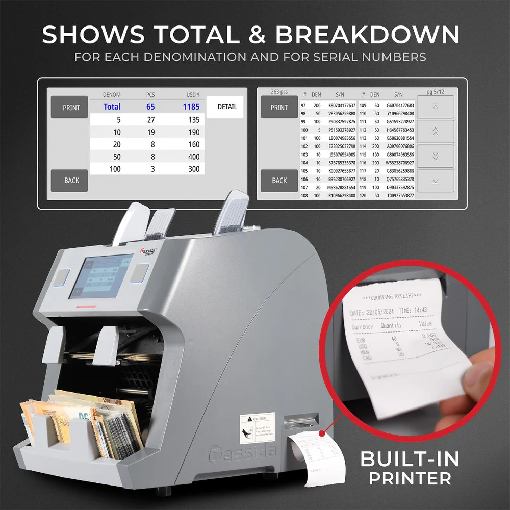 Built-in Printer: Instantly print detailed count reports, including denomination breakdowns and serial numbers, for easy record-keeping.