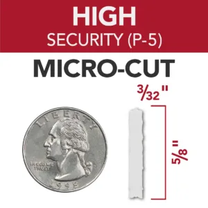 The micro cut blades compliant with the P-5 security level destroy paper, clips, staples, and credit cards into 3/32 x 5/8 inch shreds.