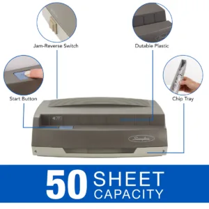 Swingline 350MD Electric 3 Hole Punch delivers consistent and precise punching, allowing you to punch through 50 sheets of paper at once.