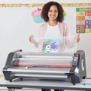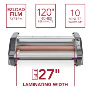 The multi-function machine features 27″ inch-wide rollers to laminate large posters and banners.