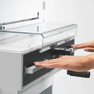 • Fully automatic tabletop cutter with electric blade drive, automatic clamp, and easy-cut blade activation.