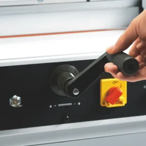 • Spindle-guided back gauge with calibrated crank.