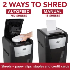 - Shreds up to 750 sheets at a time with automatic shredding, or 10 sheets at a time with manual feed.