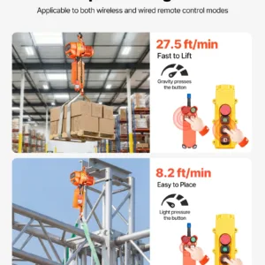 Wired & Wireless Freedom: This chain electric lift hoist offers a wired pendant for close work and a wireless remote up to 328 ft (100 m). The flexible control options help you stay comfortable and confident on every lift.