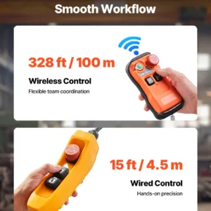 Wired & Wireless Freedom: This chain electric lift hoist offers a wired pendant for close work and a wireless remote up to 328 ft (100 m). The flexible control options help you stay comfortable and confident on every lift.