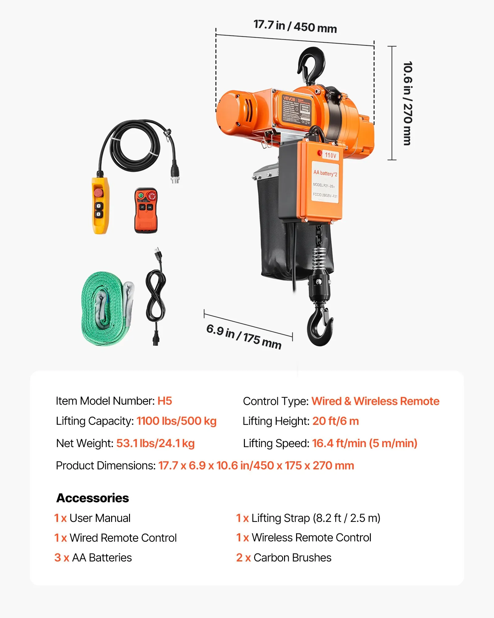 VEVOR 1100 lbs Electric Chain Hoist, 20 ft Lifting Height, 120V Single Phase Overhead Crane with 328 ft Wireless & 15 ft Wired Remote Control, Power Electric Hoist for Factories, Warehouses, Garages
