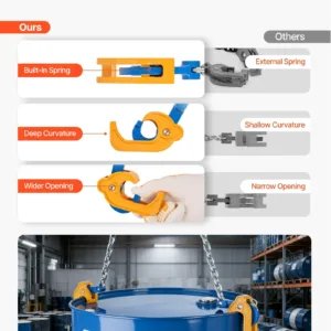 Safety Hook with Latch: Equipped with reinforced hooks with safety latches, the chain drum lifter fit oil drums securely without causing damage, ensuring a firm grip and preventing accidental detachment for more secure lifting operations.