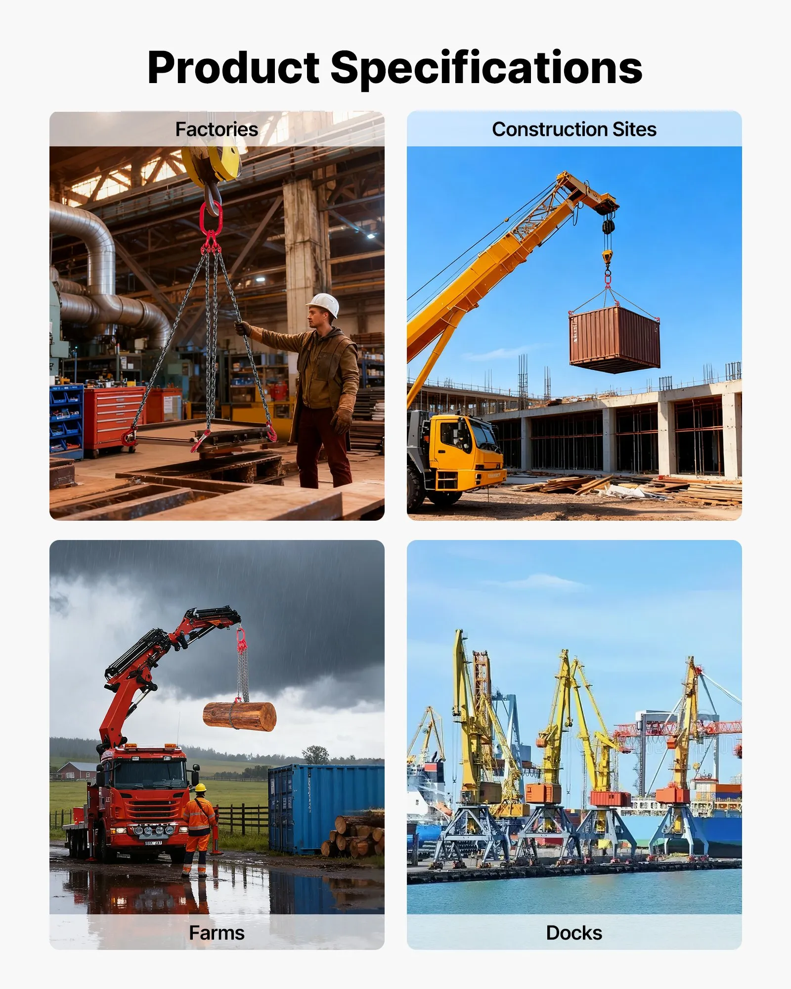 Versatile Application: This 4-leg chain sling is ideal for construction sites, factories, warehouses, mechanical transport, shipbuilding, and heavy-duty lifting projects. A multi-purpose chain for a wide range of tasks.