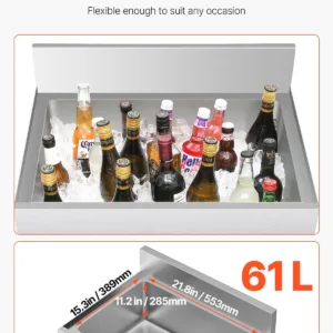 Large Capacity Storage: With internal dimensions of 21.8 x 15.3 x 11.2 in (553 x 389 x 285 mm), our commercial ice bin provides a generous 61 L capacity, making it the ideal solution for storing large amounts of ice or cooling a variety of drinks. It meets all your refrigeration needs for any occasion