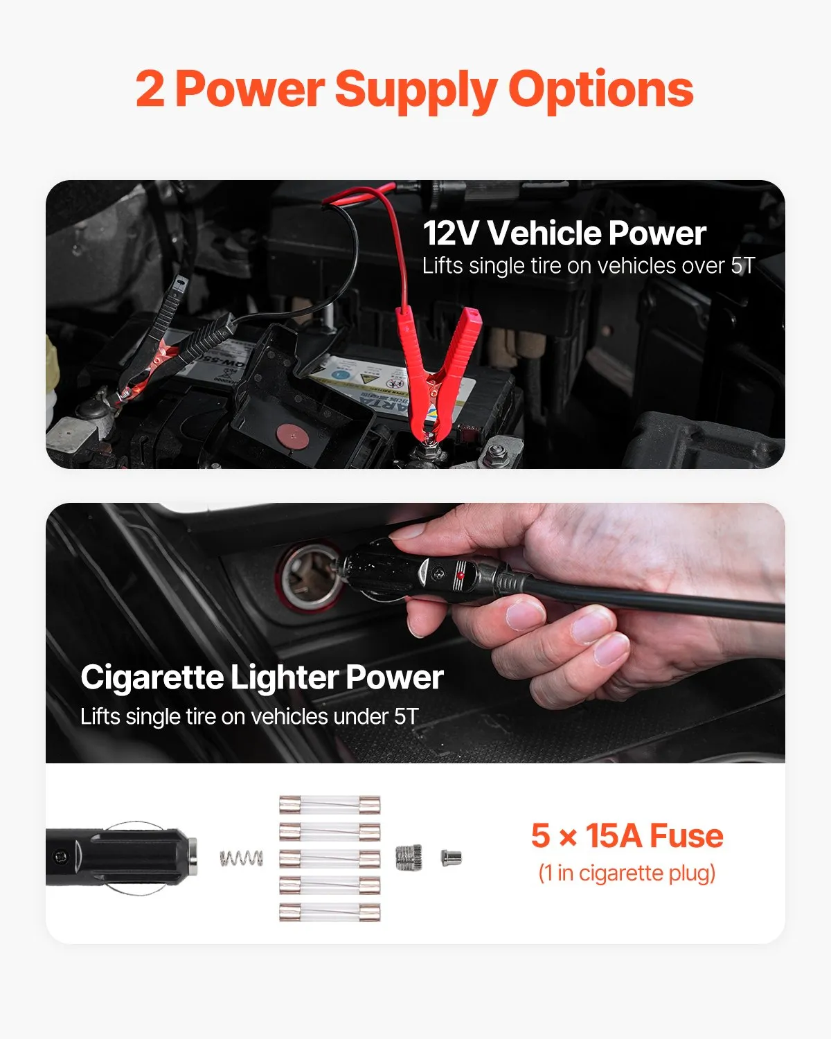 Dual Power Supply: Equipped with a cigarette lighter and 12V car power clamp for flexible power options. For vehicles over 5T, we recommend using the car power supply to ensure stable lifting. 5 spare fuses included to avoid fuse burnout.