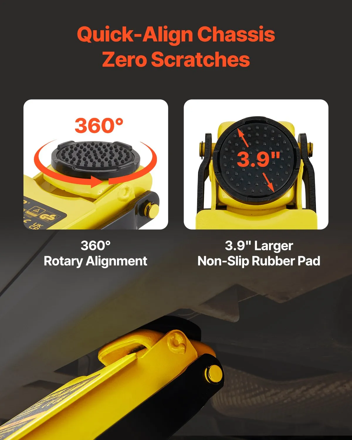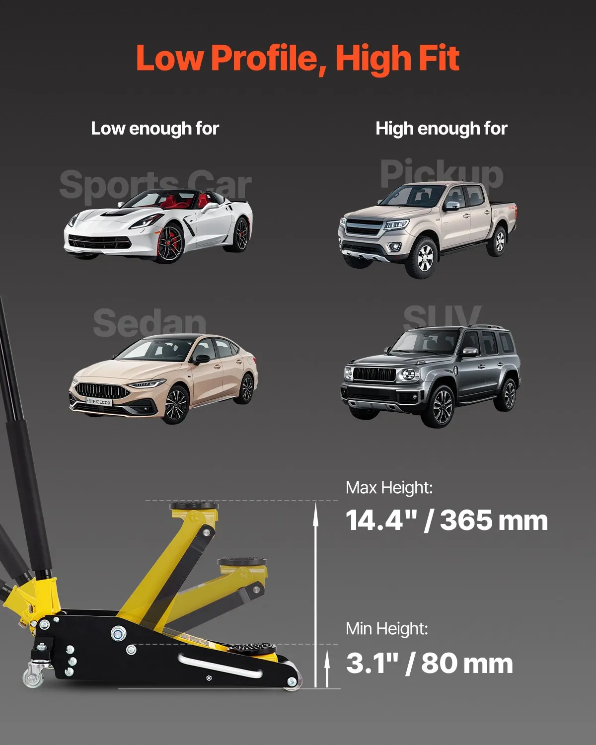 Light But Sturdy: Boasts heavy-duty steel and durable aluminum construction, VEVOR low-profile floor jack is sturdy to use and light to carry. It is equipped with 2 universal casters and one front roller, making the jack easy to maneuver, steer, or roll. And the design of the armrests on both sides is convenient for carrying and positioning.
