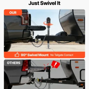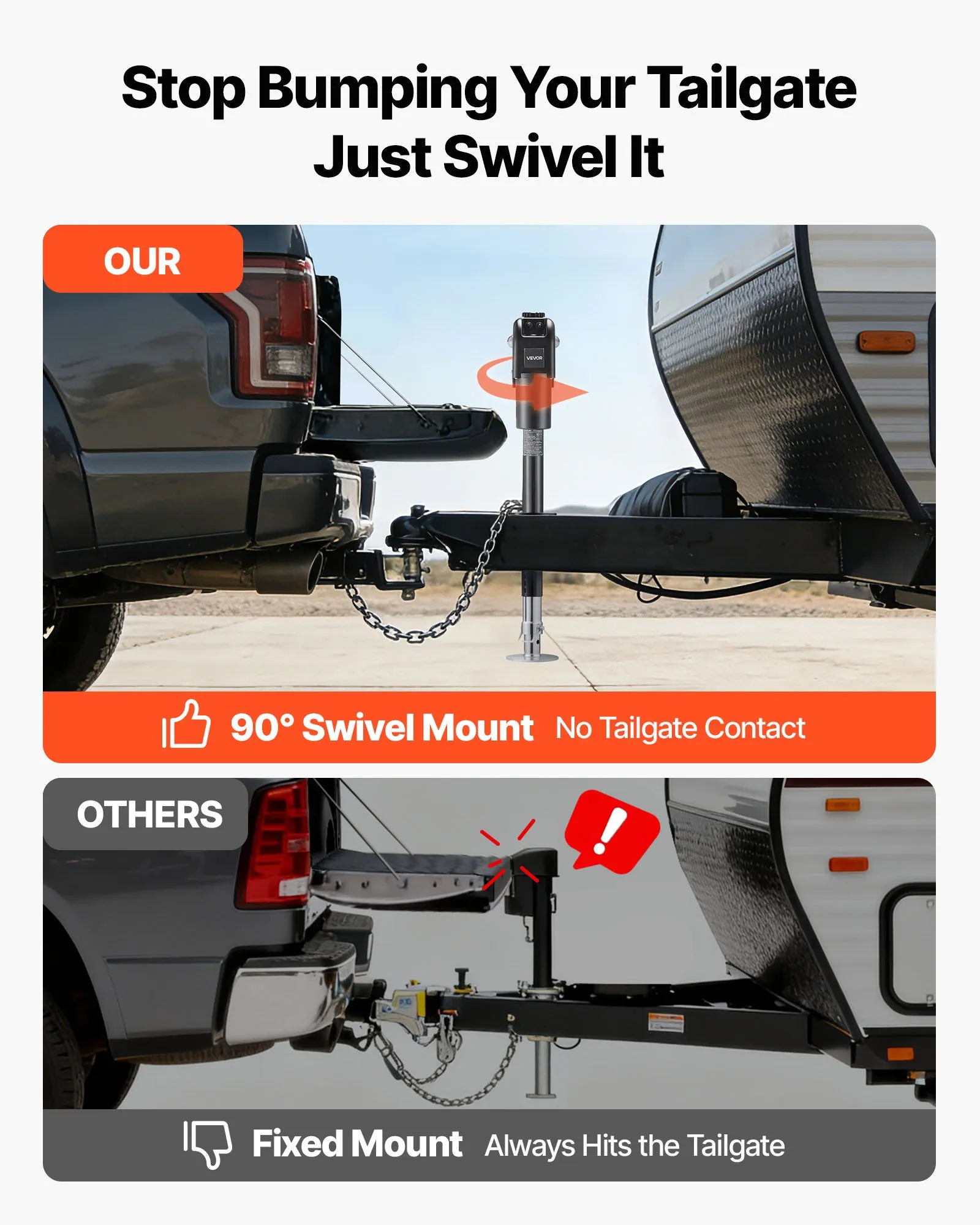 90° Rotating Base Holes: The 90° clockable base of the power trailer jack clears a pickup tailgate—no drilling or mods—so the truck bed opens freely while the jack mounts neatly on the A-frame.