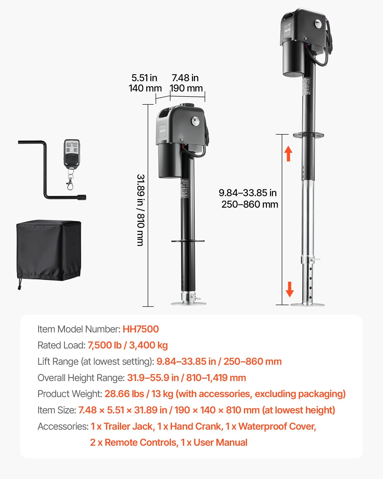 VEVOR HH7500 Electric Trailer Jack, 7500 lbs Capacity, Electric Power Tongue Jack with Waterproof Protective Cover & LED Light for Travel Trailer, Camper, RV, 9.84-27.84 in Lift, 12V DC with Wiring, Black