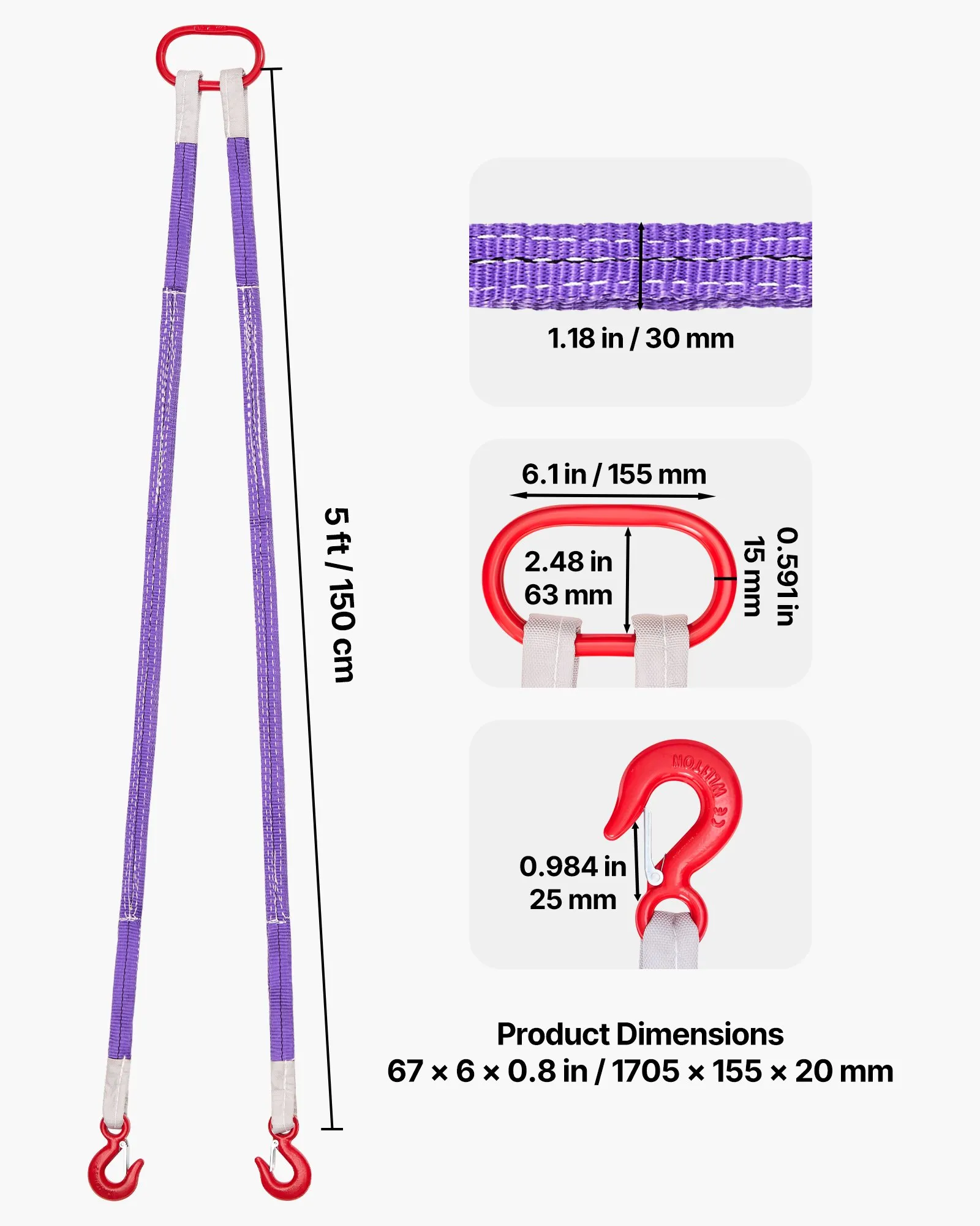 Safety Latch Design: The bridle web sling straps feature a heavy-duty hook with a security latch to prevent accidental detachment, ensuring safe and secure lifting operations.
