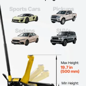Wide Lift Range: The floor jack lifts from 2.95–19.7 in (75–500 mm). Low-profile design slides easily under sedans, while providing ample lift height. Tighten the release valve and pump to raise, then turn the handle counterclockwise for smooth lowering.