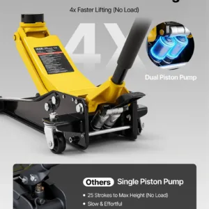 Secure & Stable Support: This heavy-duty low profile car jack features an all-steel construction and a dual-piston pump system for stable, reliable lifting. An upgraded ergonomic easy-grip handle makes positioning and pumping smoother and easier.