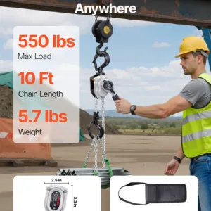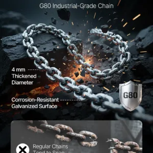 G80 Industrial-Grade Chain: The chain hoist comes with 10 Ft / 3 m G80 alloy chain, 4 mm thick, galvanized for corrosion-resistance. Strong and sturdy for harsh work, ensuring reliable lifting in construction, warehouses, and industrial tasks.