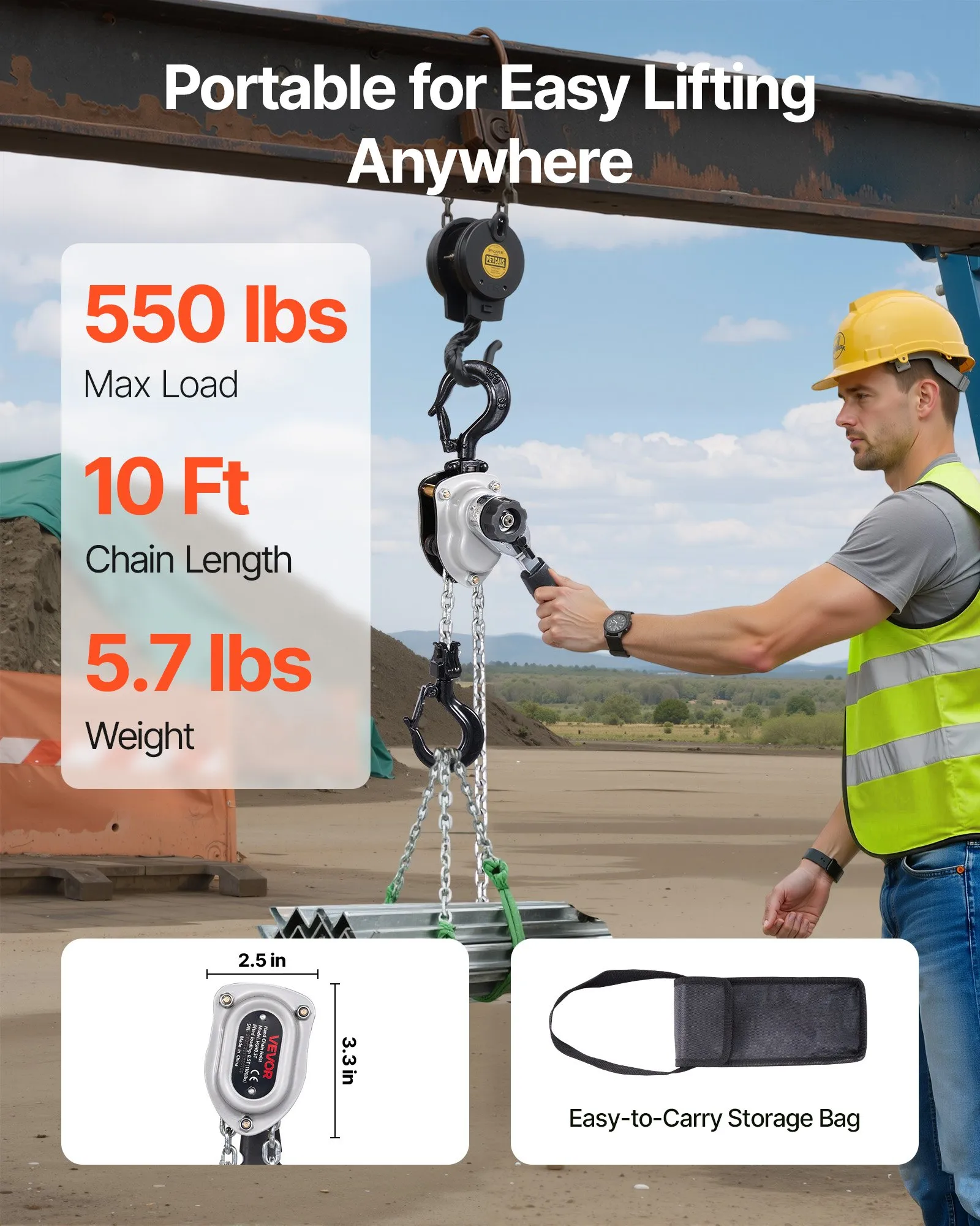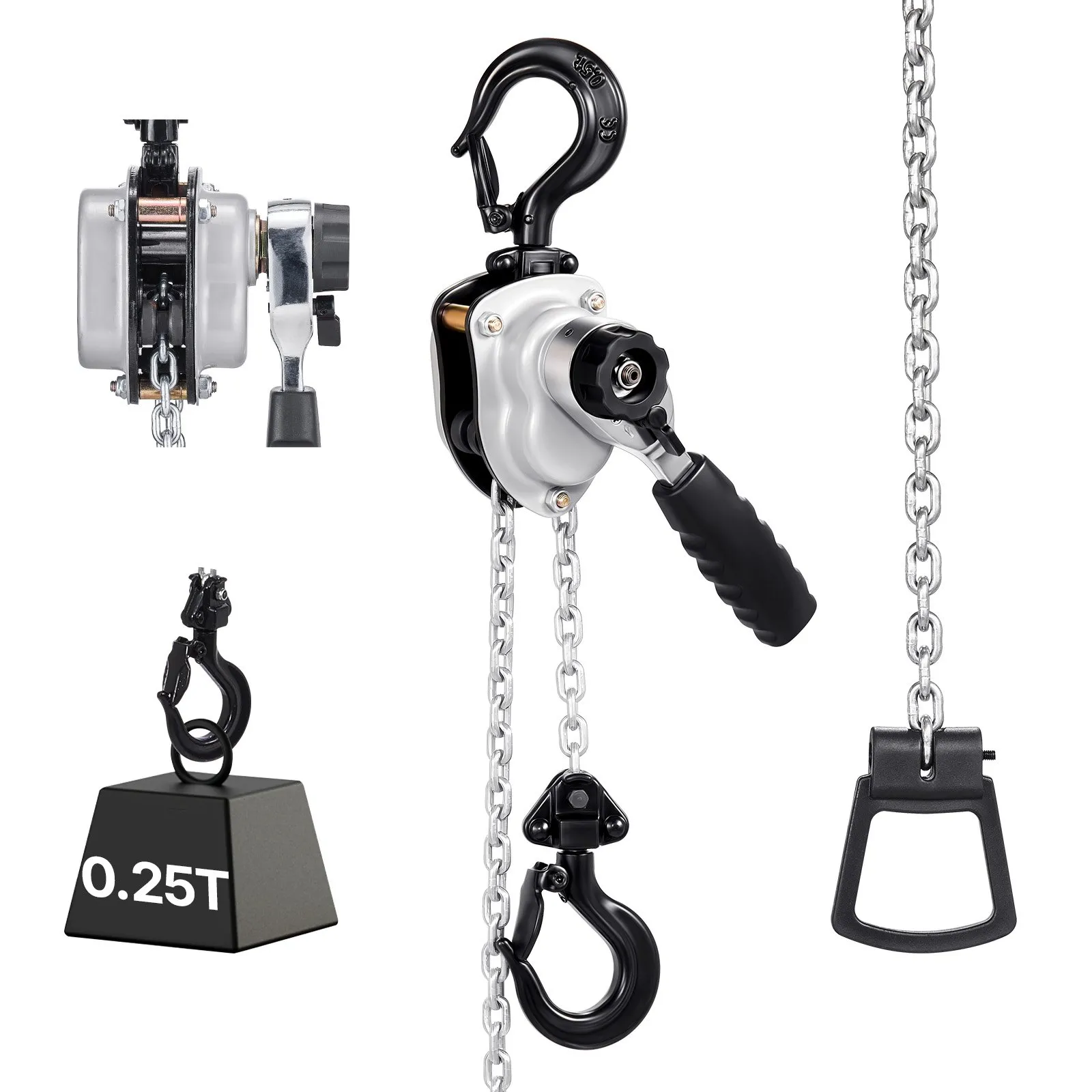 VEVOR Manual Lever Chain Hoist, 1/4T 550LBS Capacity Heavy Duty Come Along, 10FT Lift G80 Alloy Steel Chain With Dual Pawl Mechanical Brake,360°Rotating Hooks, for Warehouse Construction Garage
