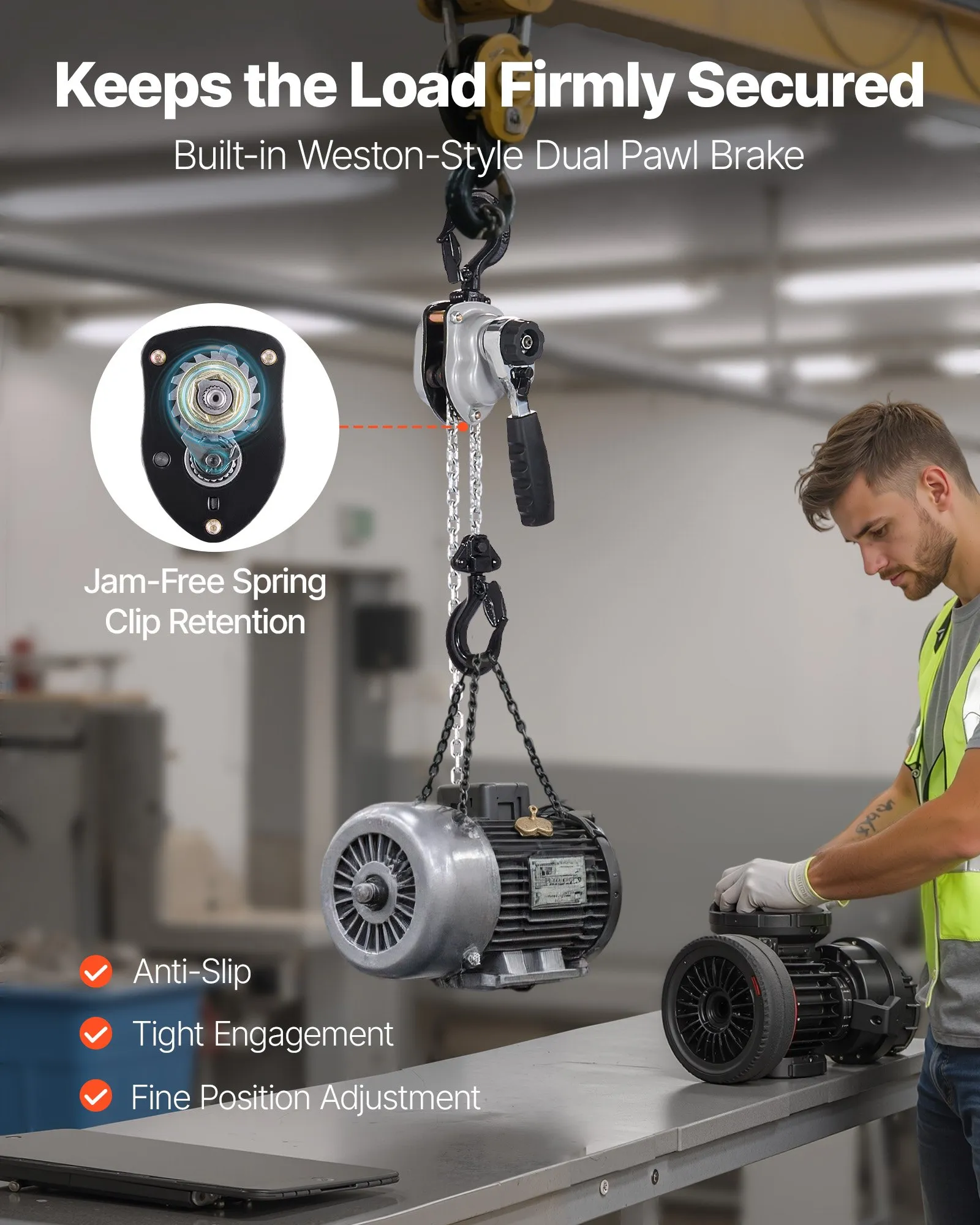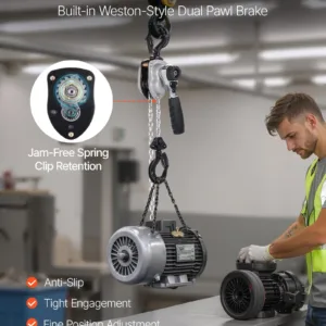 Secure and Reliable Braking: This manual chain hoist features Weston dual pawl brake engaged with gears for precise control. Strong build avoids slipping and sudden drops, evenly spreads pressure, boosting security and extending service life.