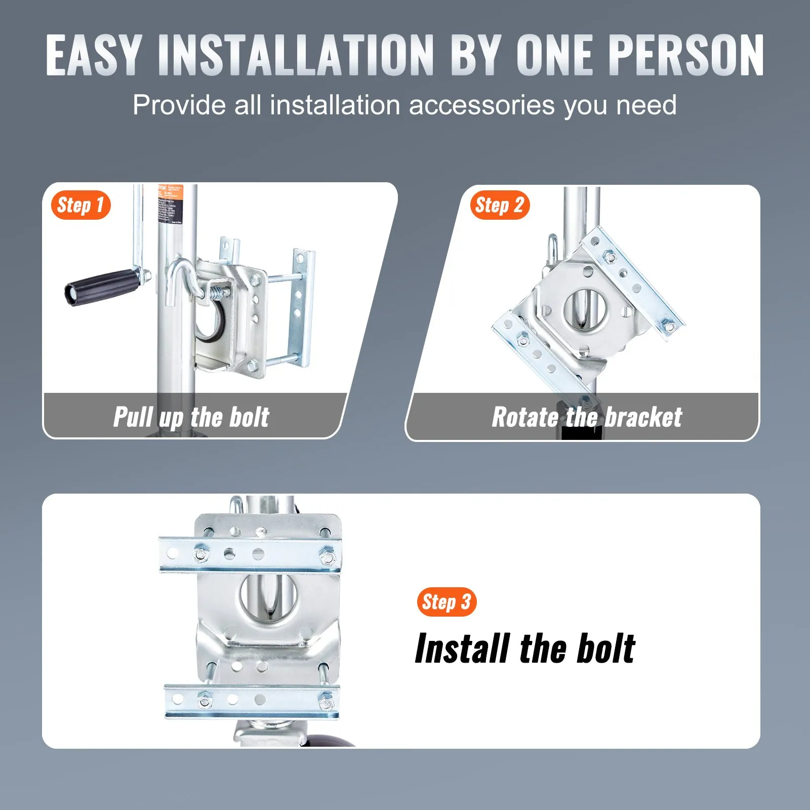 Easy Installation: Our boat trailer jack comes with all the necessary parts and detailed assembly instructions. It can be bolted or welded onto the trailer tongue and has a swivel function that allows it to swing up parallel to the tongue for easy maneuverability.