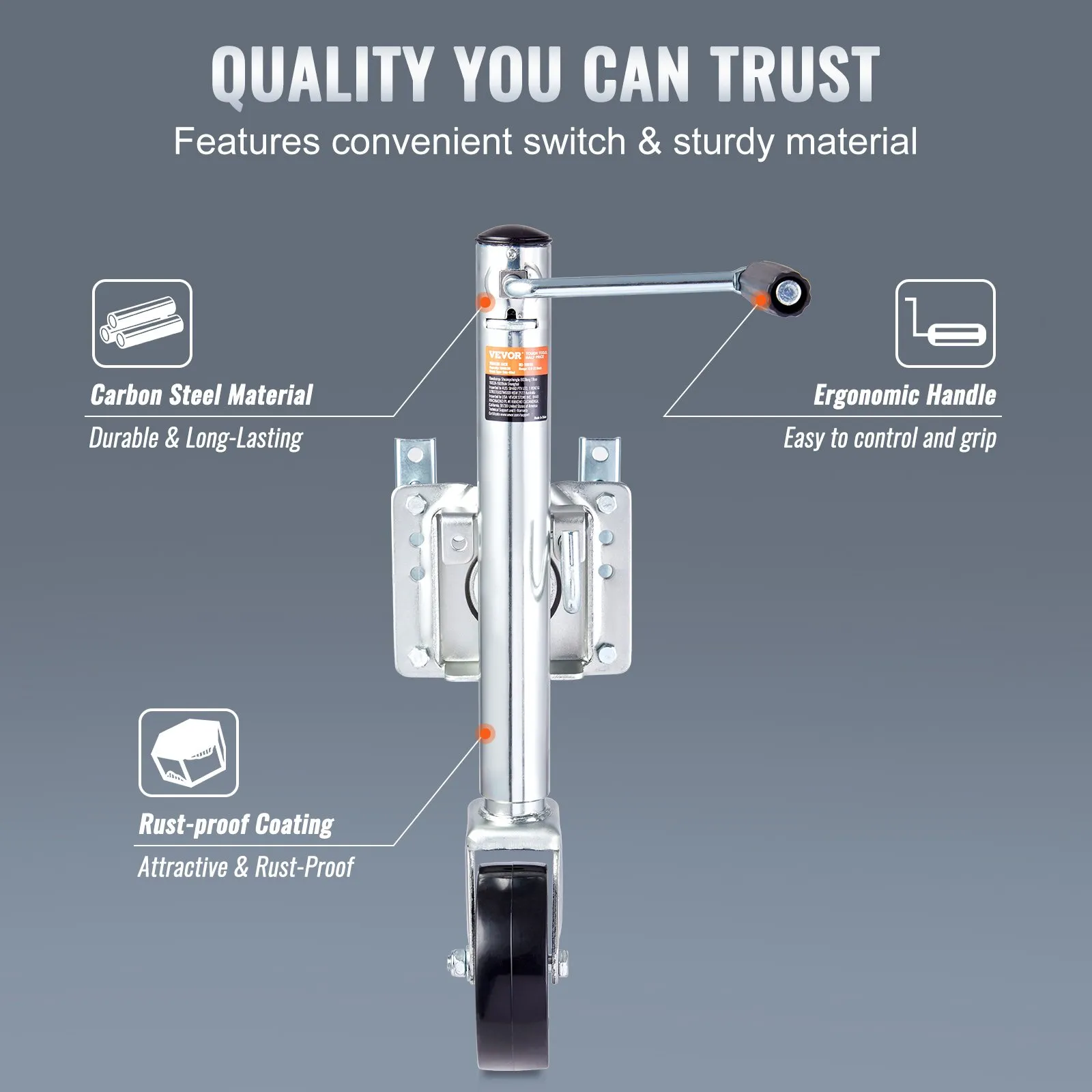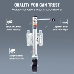 Designed for Stability & Durability: This trailer jack stand is engineered to deliver exceptional stability and long-lasting performance. Crafted from heavy-duty carbon steel, it offers maximum strength and rigidity. The galvanized inner and outer tubes and powder finish provide enhanced corrosion resistance.