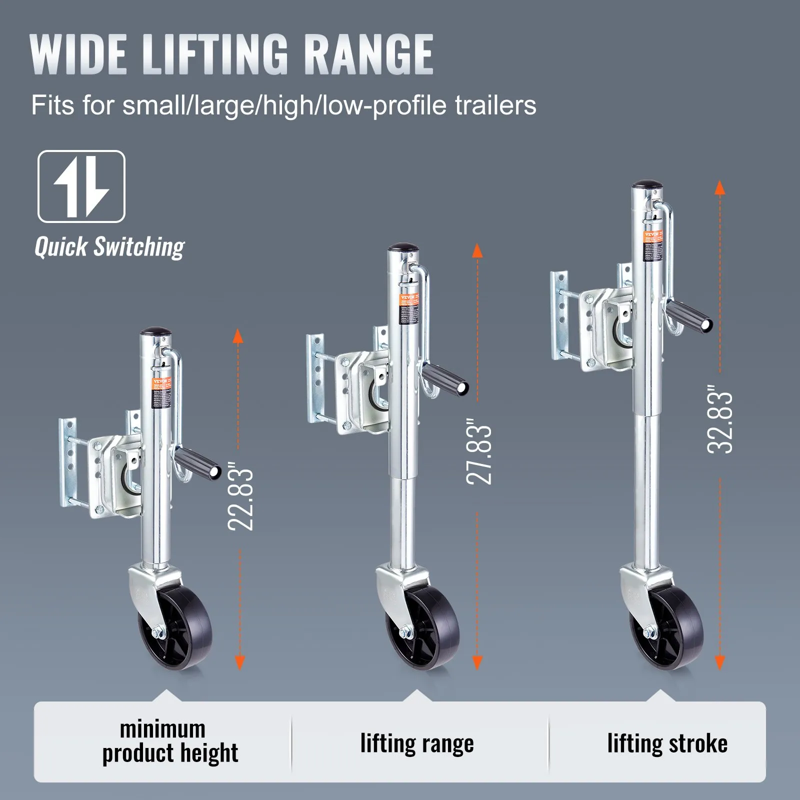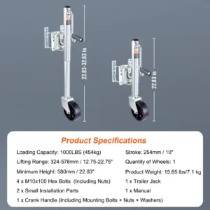 Heavy-Duty Load Capacity: The VEVOR trailer jack boasts an impressive lifting capacity of 1000 lbs, making it a powerful tool for lifting tasks. With a lifting range of 12.75 to 22.75 inches, it fits for no matter high-profile or low-profile trailers.