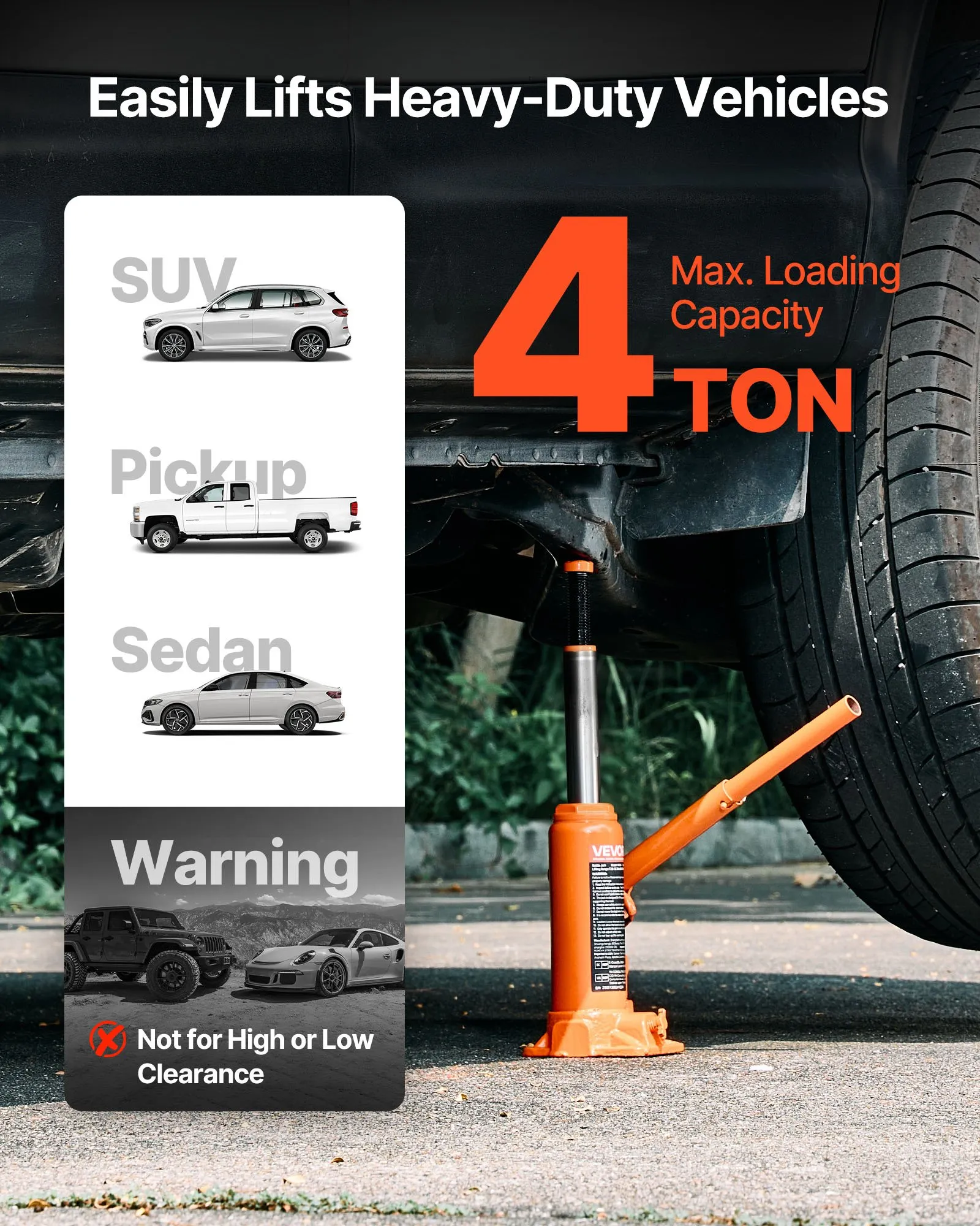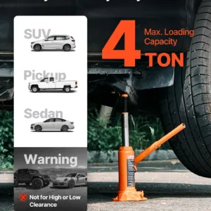 Stable Lifting: Our hydraulic bottle jack handles up to 4 tons (8,818.4 lbs), great for sedans, small pickups, and SUVs. It also works on farm tools and compact machines. For safe lifting, choose a 4-ton jack if your vehicle weighs 2.5 tons or less.
