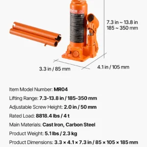 VEVOR MR04 Hydraulic Bottle Jack, 4 Ton (8818.4 lbs) Capacity, 7.3-13.8 Inch Lifting Range, Heavy Duty Welded Bottle Jack for Car, SUV, Pickup, Auto Repair, House Lift and Agricultural Equipment, Orange