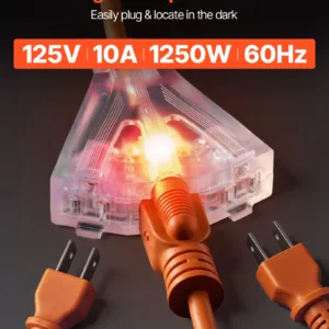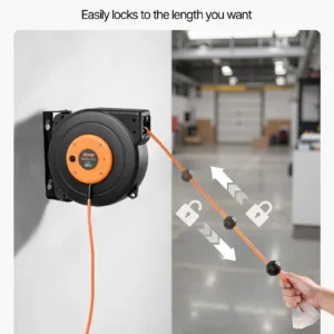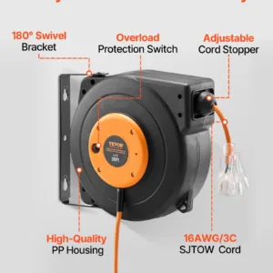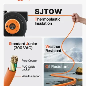 Solid Material, Durable Wiring: The extension cord is made from high-quality SJTOW wire and is ETL certified. The 30 ft SJTOW outdoor waterproof and oil-resistant material is suitable for various challenging environments, ensuring durability. Furthermore, the retractable cord reel has a robust structure, ensuring high reliability.
