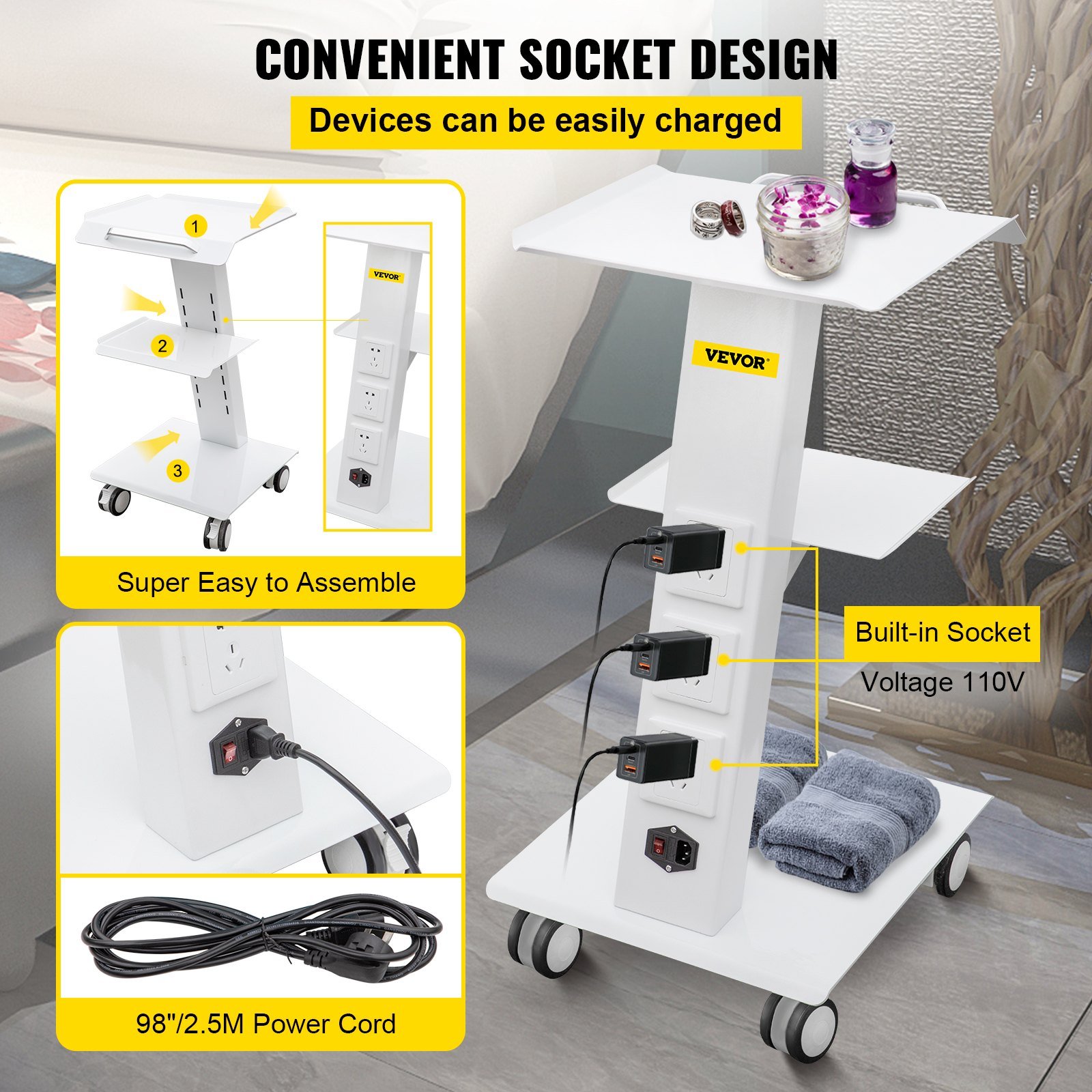 VEVOR T3 Lab Trolley, Built-in Socket Rolling Lab Cart, 3 Layers Tray Rolling Clinic Cart, 360° Silent Rolling Wheels w/ Foot Brake, 88 lbs Weight Capacity Sturdy Steel Frame, for Lab Clinic Beauty Salon