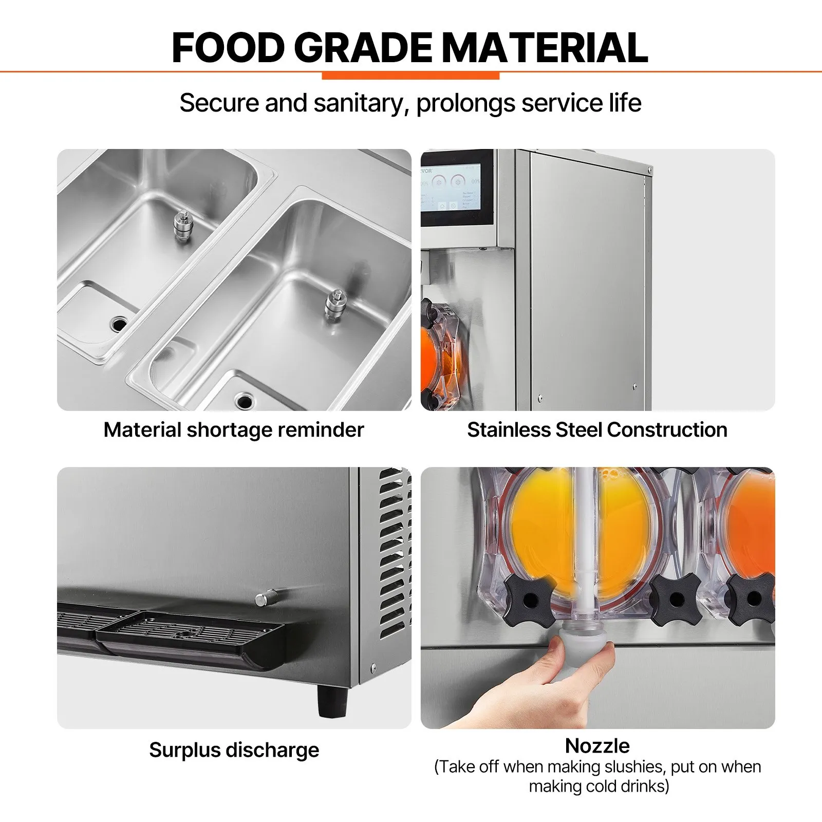 Quality that Can’t be Beaten: The entire slushy machine is made of high-quality stainless steel, which has excellent corrosion and rust resistance, withstand high pressure and is easy to clean. The ingredient tank and cooling tank are specially made with food-grade 304 stainless steel material. There is a small hole in the body for discharging the remaining ingredients to avoid clogging.