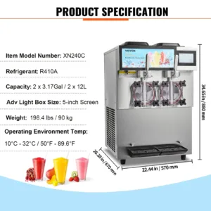 2 x 12L Commercial Slushy Machine: Double tank slushy machine, every tank features 12L (3.17 US gal) in capacity (8L for the ingredient tank and 4L for the cooling tank). Our commercial slushy machine can make 24L of slushy and 19L of alcoholic drinks per hour, catering to many people at the same time. Enjoy the taste of summer all year round!